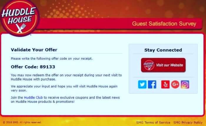 - This concludes your HuddleFeedback Survey. Now, you will be provided with a validation code which is needed to be redeemed on your next visit to the Huddle House.